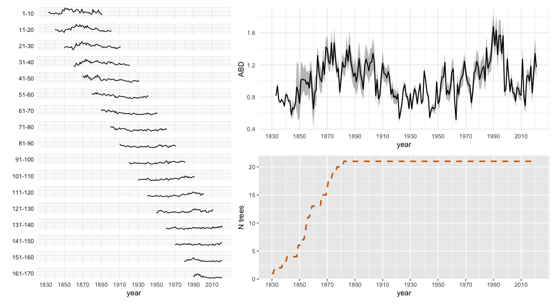 Top-right panel: Final ABD chronology with standard error bands, representing growth corrected for age effects
