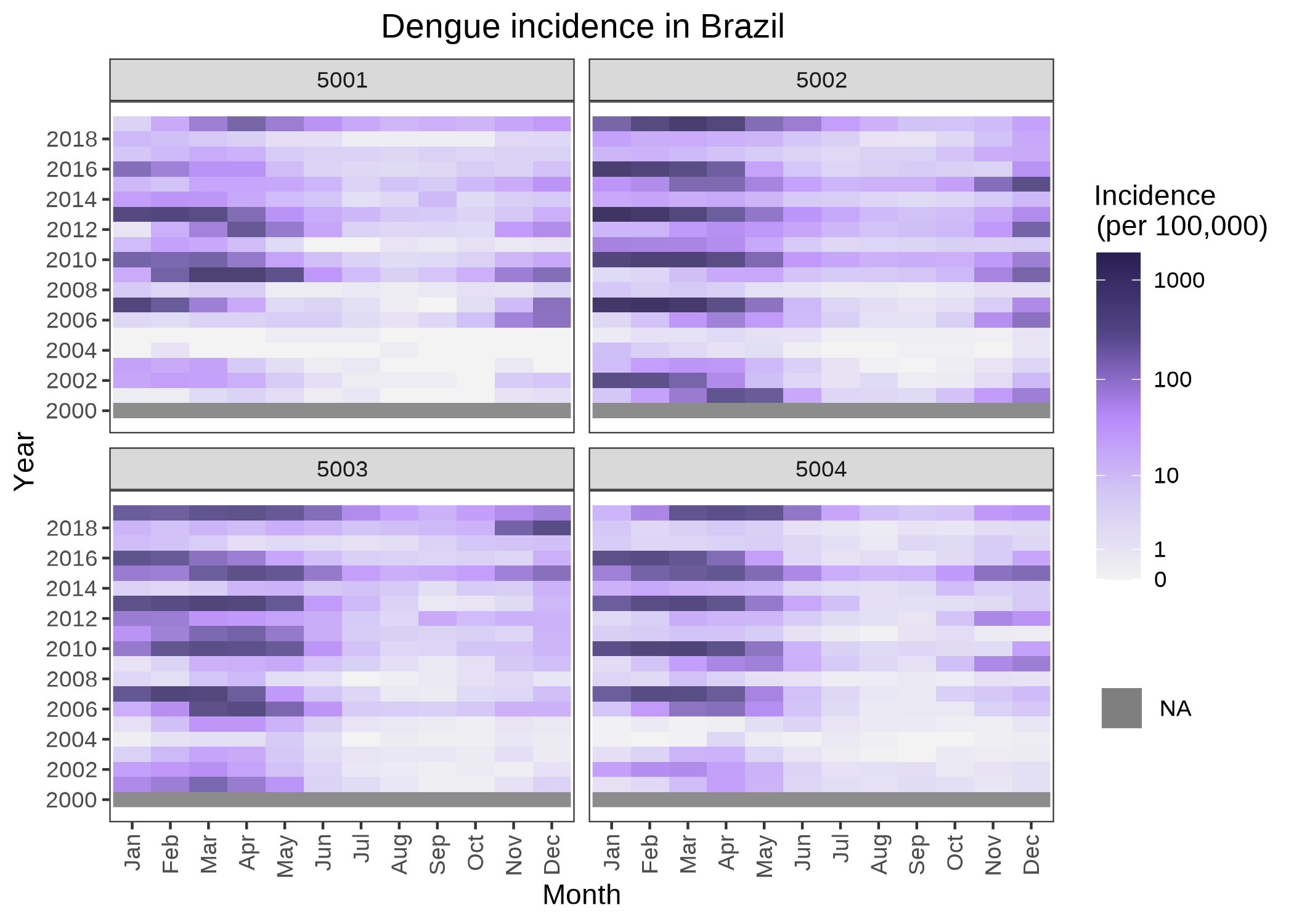 plot_timeseries: Plots time series of covariates, case counts or incidence rates.plot_timeseries2: Plots time series of two covariates, case counts or incidence rates using a dual-axis plot.plot_heatmap: Plots a time series of covariates, case counts or incidence rates as heatmaps.plot_seasonality: Plots yearly time series to detect seasonal patterns of covariates, case counts or incidence rates.plot_correlation: Plots a correlation matrix of a series of variables.plot_map: Plots a choropleth map of covariates, case counts or incidence rates.plot_bivariate: Plots a bivariate plot of two numerical and/or categorical variables.plot_multiple,plot_combineandplot_compare: Used to generate graphs of several variables at the same time.epiyw_to_dateanddate_to_epiyw: Functions to convert between dates and epidemiological year-weeks for any day of the week.