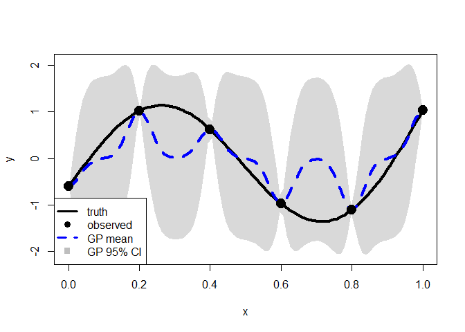 legend("bottomleft", legend = c("truth", "observed", "GP mean", "GP 95% CI"),