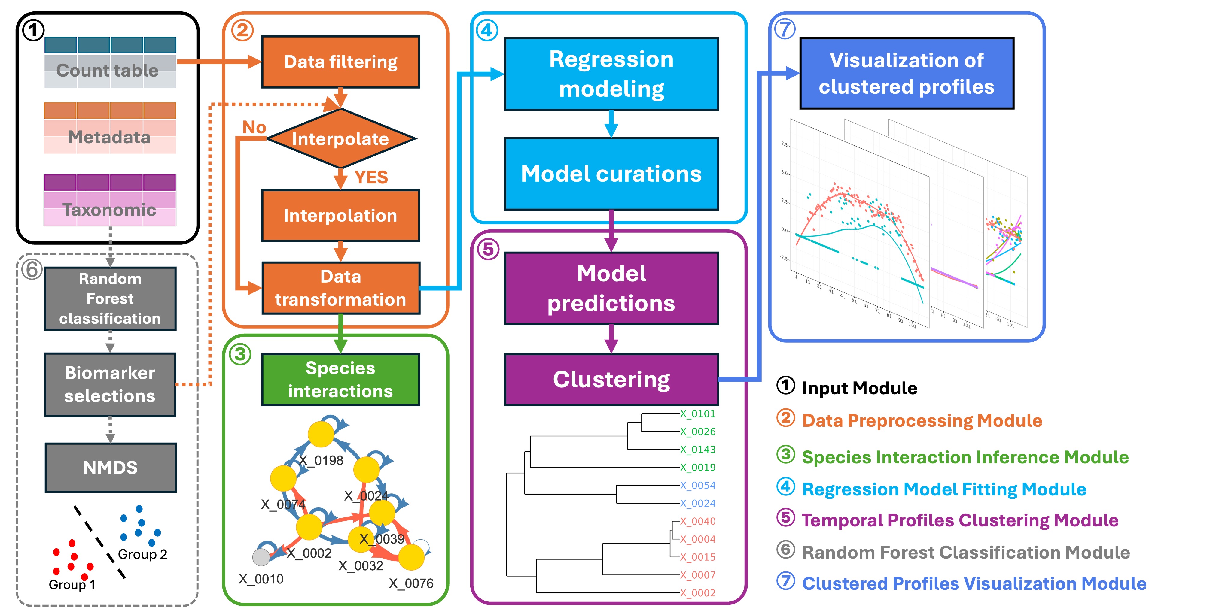 MicrobTiSDA focuses on analyzing microbiome time-series data. Its core functionalities include inferring species interaction relationships within time-series data, constructing abundance time regression models for microbial features, and assessing the similarity of temporal abundance patterns among different microbial features. It integrates the “Learning Interactions from Microbial Time Series” algorithm based on the discrete-time Lotka-Volterra model, and supports the construction of natural spline regression models to characterize changes in microbial feature abundance over time.