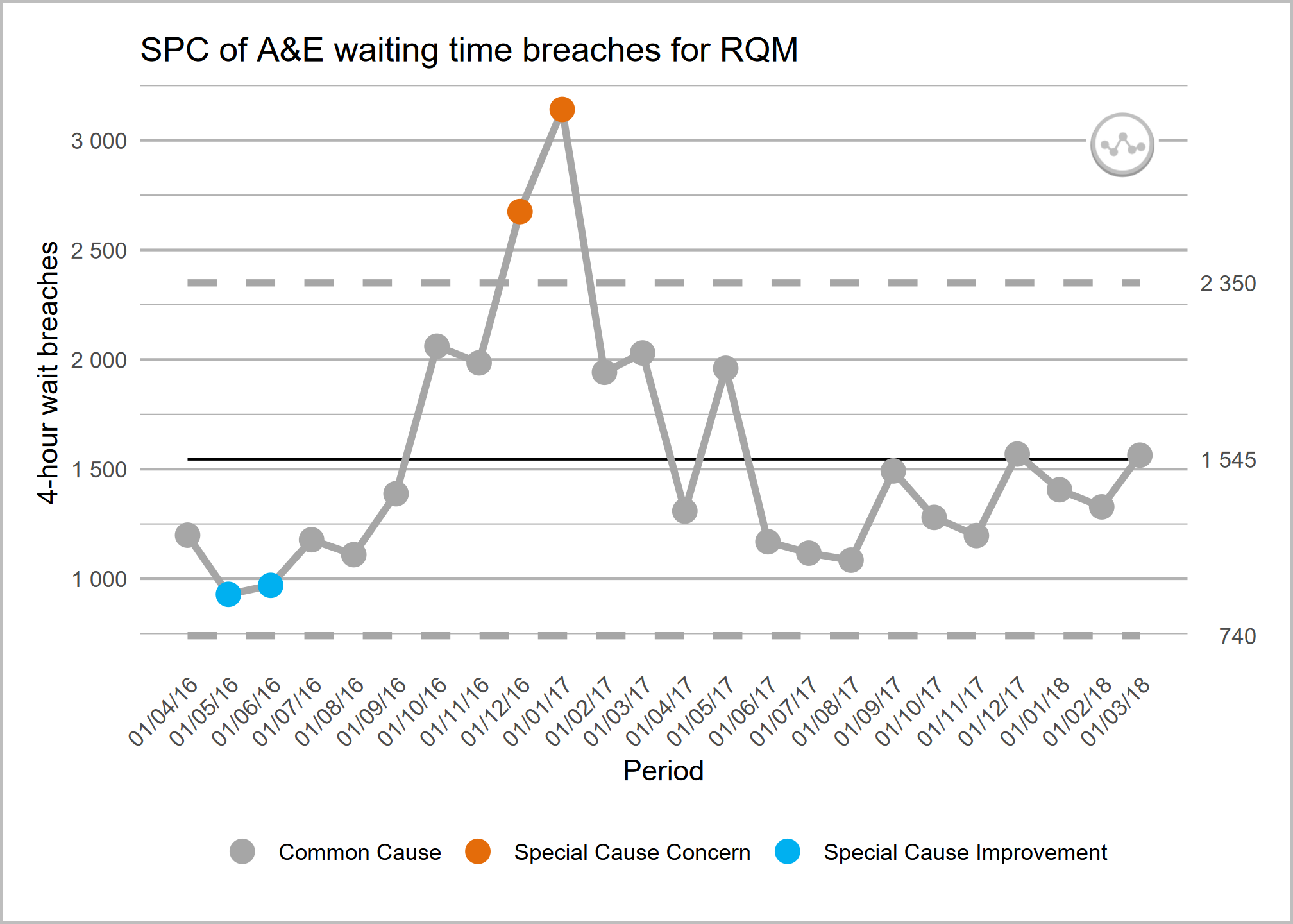 main_title = "SPC of A&E waiting time breaches for RQM",