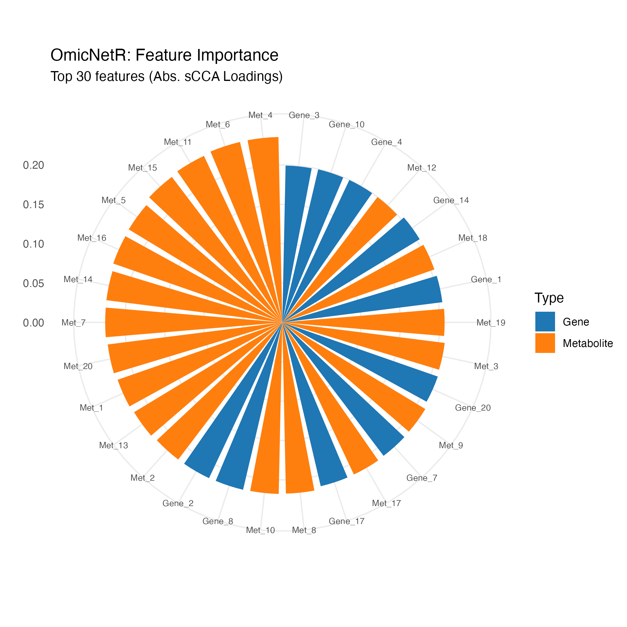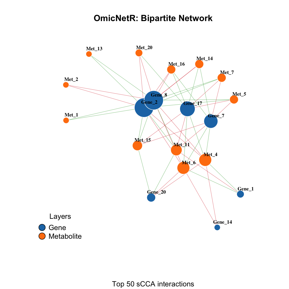 OmicNetR is an R package for integrative multi-omics analysis using Sparse Canonical Correlation Analysis (sCCA). It supports an end-to-end workflow for aligning multi-omics datasets, fitting an sCCA model, creating a gene–metabolite bipartite network, and generating summary visualizations.