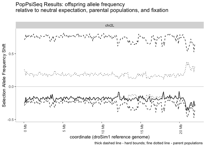 PopPsiSeqR is a package intended for analyzing the results of evolution & resequencing experiments. It builds on previous software published in @Earley2011. Offspring allele frequency spectrum is compared to the parental populations’ spectra and their expected equilibrium, in order to detect selected-for genomic regions.