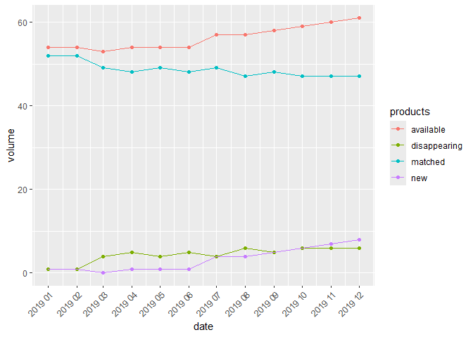 The second one, dataMATCH, can be used to demonstrate the data_matching function and it will be described in the next part of the guidelines. Generally, this artificial data set contains the following columns: time - dates of transactions (Year-Month-Day); prices - prices of sold products; quantities - quantities of sold products; codeIN - internal product codes from the retailer; codeOUT - external product codes, e.g. GTIN or SKU in the real case; description - descriptions of sold products, eg. ‘product A’, ‘product B’, etc.