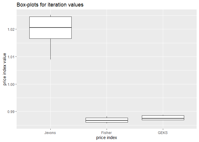 This function presents a comparison of selected indices obtained by using the jackknife method. In particular, it returns a list with four elements: iterations, which is a data frame with basic characteristics of the calculated iteration index values (means, standard deviations, coefficients of variation and results for all sample), pseudovalues, which is a data frame with basic characteristics of the calculated index pseudovalues obtained in the jackknife procedure (i.e. the jackknife estimators and their standard deviations and coefficients of variation), figure_iterations which presents a box-plot for the calculated iteration index values, and figure_pseudovalues which presents a box-plot for the calculated index pseudovalues obtained in the jackknife procedure. Please follow the example, in which the Jevons, Fisher and GEKS indices are compared by using the jackknife method: