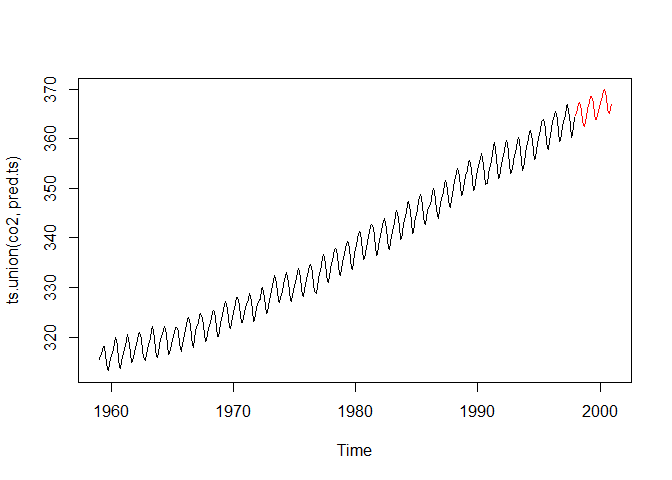 plot(ts.union(co2, pred.ts), plot.type = "single", col = c("black", "red"))