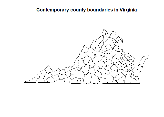title("Contemporary county boundaries in Virginia")