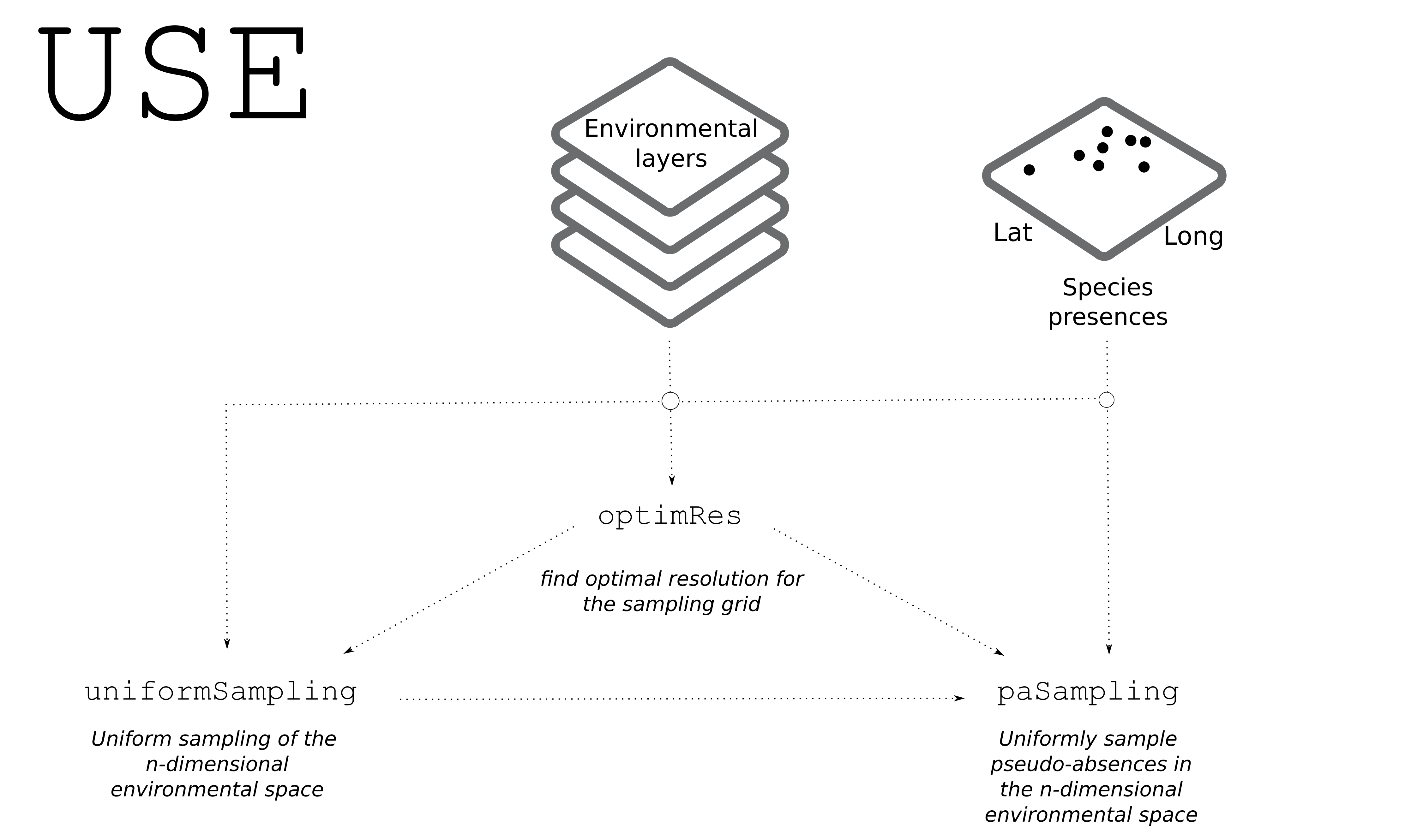 The USE R package offers a collection of functions that enable the uniform sampling of the environmental space. It was specifically developed to assist species distribution modellers in gathering ecologically relevant pseudo-absences by uniformly sampling the environmental space.