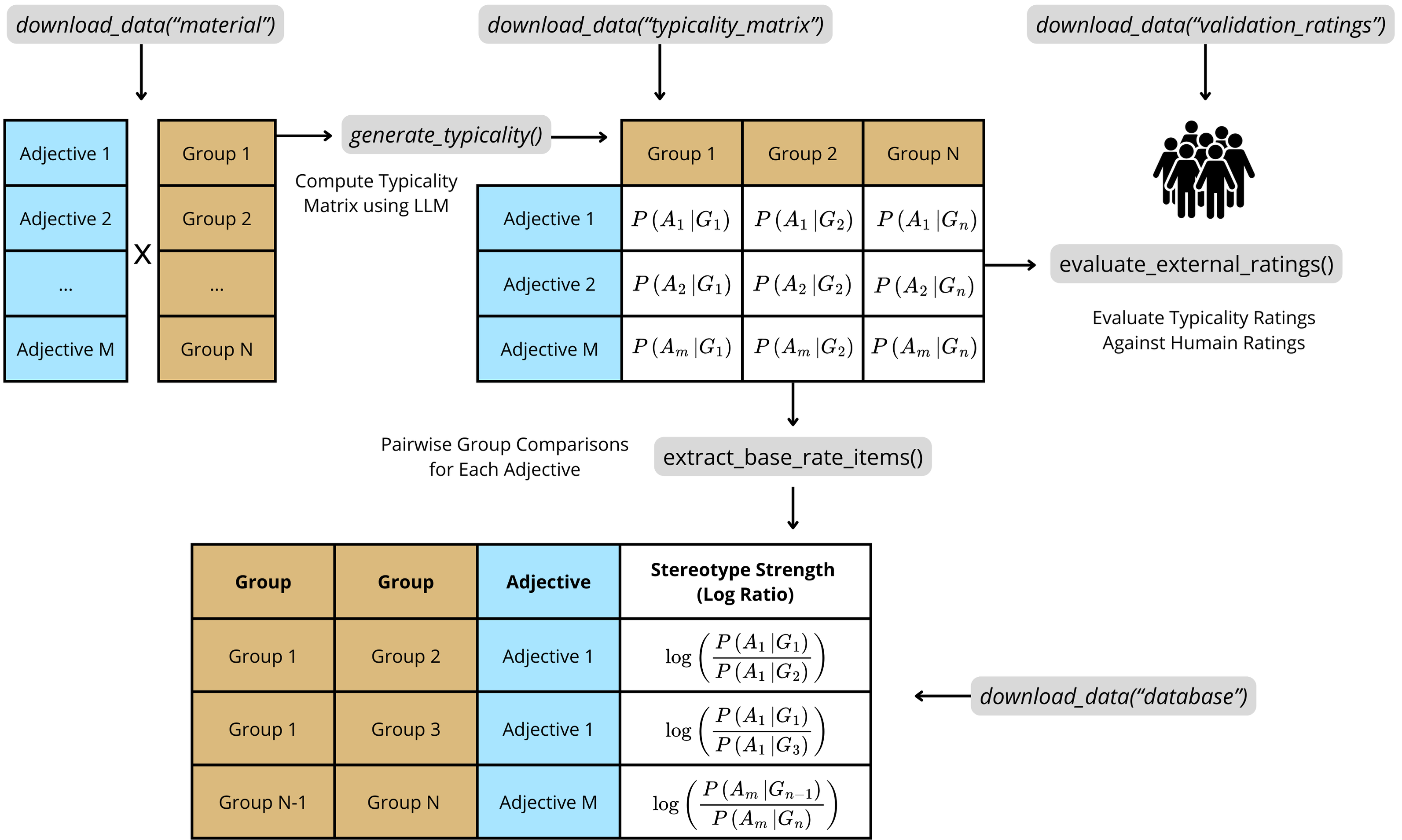 It is designed to streamline the creation of base-rate neglect items for reasoning experiments. A base-rate neglect item typically involves two groups (e.g., “engineers” and “construction workers”) and a descriptive trait (e.g., “nerdy”). Participants are presented with statistical information (base-rates; e.g., “There are 995 construction workers and 5 engineers”) and stereotypical information (the descriptive trait). Their task is to decide the most likely group membership of an individual described by that trait. The “typicality rating” generated by large language models quantifies how strongly certain traits (e.g., “nerdy,” “kind”) or descriptions are (stereo)typically associated with specific groups (e.g., engineers, nurses). This allows researchers to precisely measure and control “stereotype strength”–the extent to which a given description is perceived as belonging more strongly to one group over another (e.g., the trait “nerdy” is typically seen as more characteristic of engineers than of construction workers).
