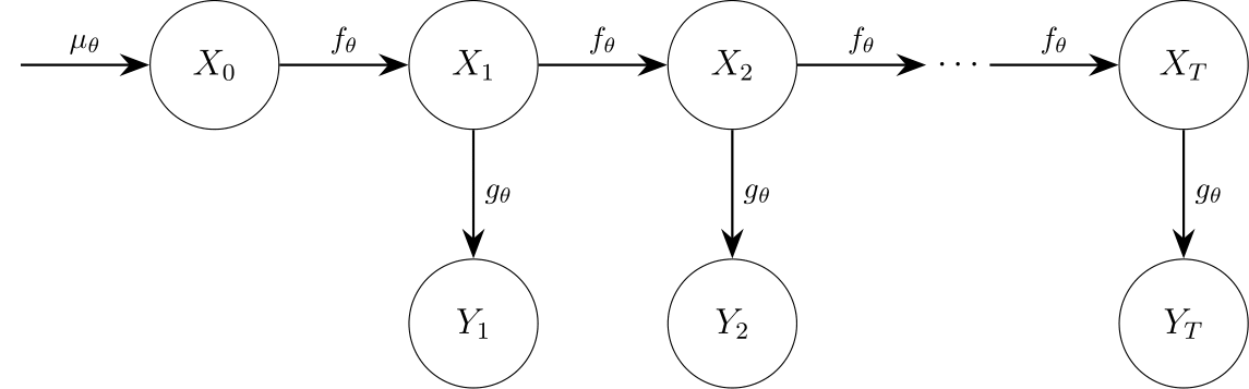 A state-space model (SSM) has the structure given in the following diagram, where we omitted potential time dependency in the transition and observation densities for simplicity.