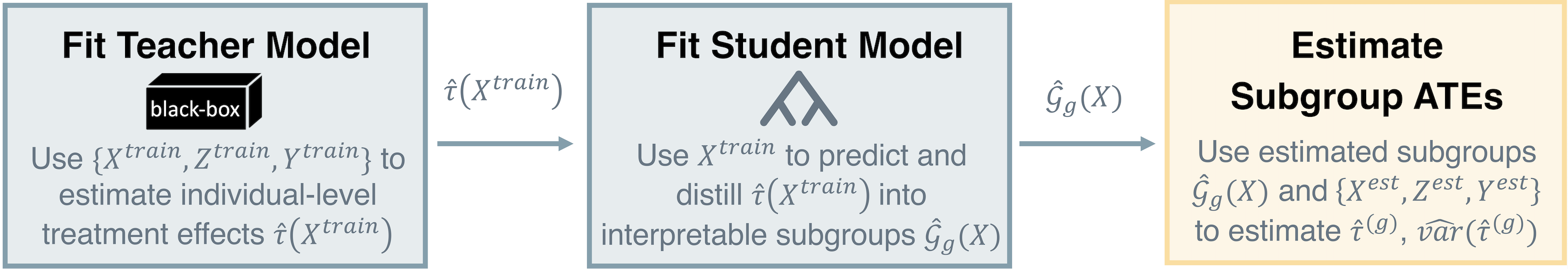Briefly, CDT is a two-stage learner that first fits a teacher model (e.g., a black-box metalearner) to estimate individual-level treatment effects and secondly fits a student model (e.g., a decision tree) to predict the estimated individual-level treatment effects, in effect distilling the estimated individual-level treatment effects and producing interpretable subgroups. This two-stage learner is learned using the training data. Finally, using the estimated subgroups, the subgroup average treatment effects are honestly estimated with a held-out estimation set.