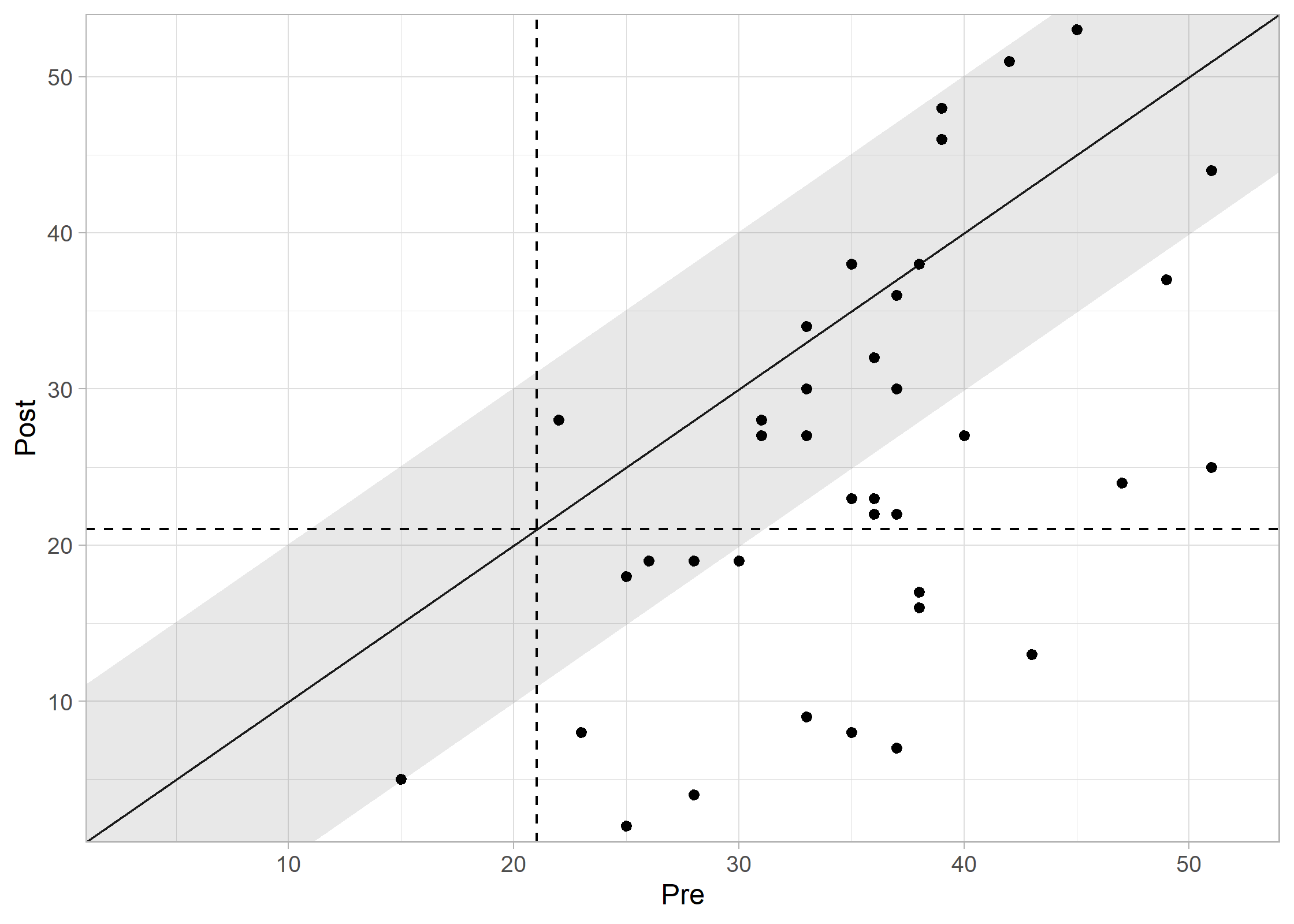 Interpreting the Plot: * Recovered (Green): Reliable improvement + moved to functional range. * Improved (Blue): Reliable improvement, but still in clinical range. * Unchanged (Grey): No reliable change. * Deteriorated (Red): Reliable worsening.