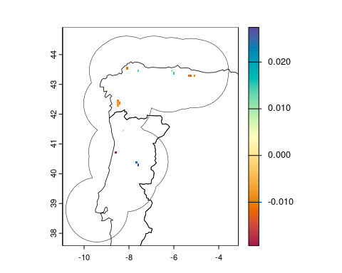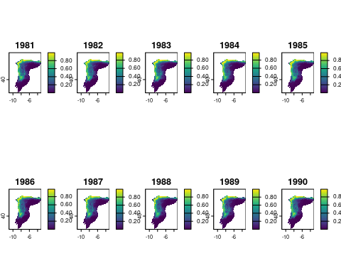 Let’s now compute the model predictions for each year, optionally delimiting them to the modelled region (though you can predict on a larger or an entirely different region, assuming that the species-environment relationships are the same as in the modelled region), and optionally exporting the results to a file: