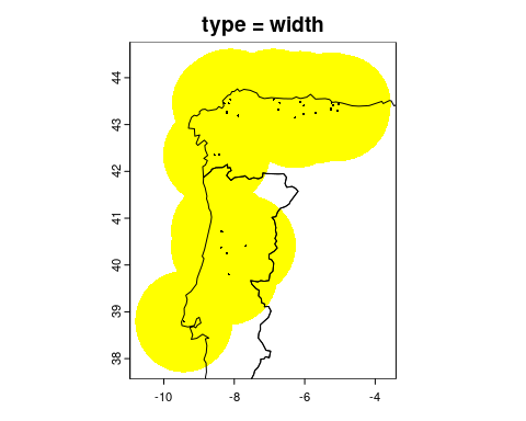 You should also delimit a region for modelling. You can provide your own spatial extent or polygon – e.g., a biogeographical region that is within your species’ reach, and within which that species was reasonably surveyed (mind that pixels within your region that don’t overlap species presences are taken by Maxent as available and unoccupied). Alternatively or additionally, you can use e.g. the code below to compute a reasonably sized area around your species occurrences (see help file and try out different options, some of which may be much more adequate for your particular case!):