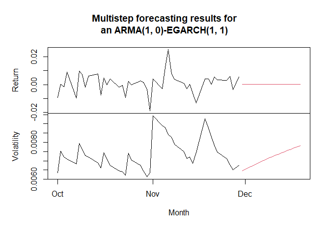 : a forecasting method to compute multistep point forecasts of the conditional mean and the conditional standard deviation following one of the package’s fitted models,predict_roll()