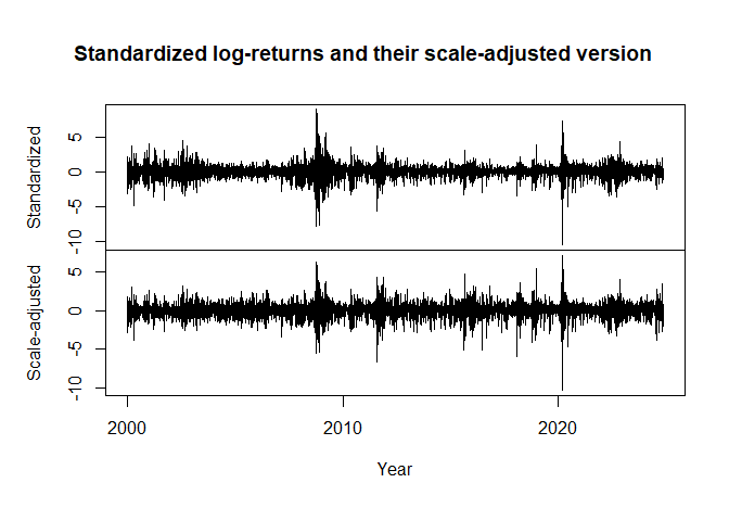 , namely the Standard and Poor’s 500 daily log-return series from January 04, 2000, until November 30, 2024, obtained from Yahoo Finance. The series is formatted as a time series object of class "zoo"