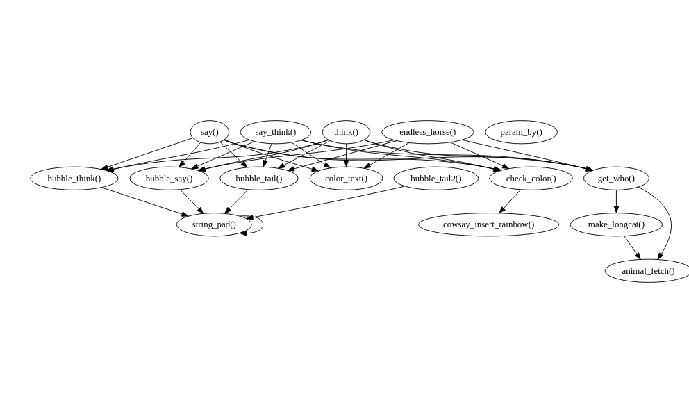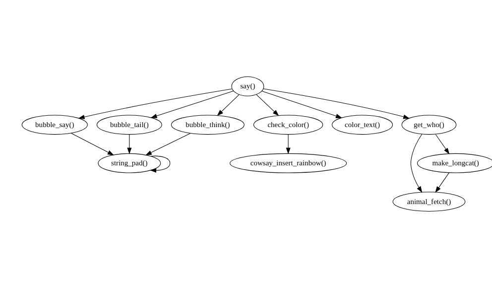 You can use this feature when exploring code in other packages: calling foodweb() on a function in another package will show you how functions in that package relate to each other. I’m using cowsay here as it’s small enough that the output is readable.