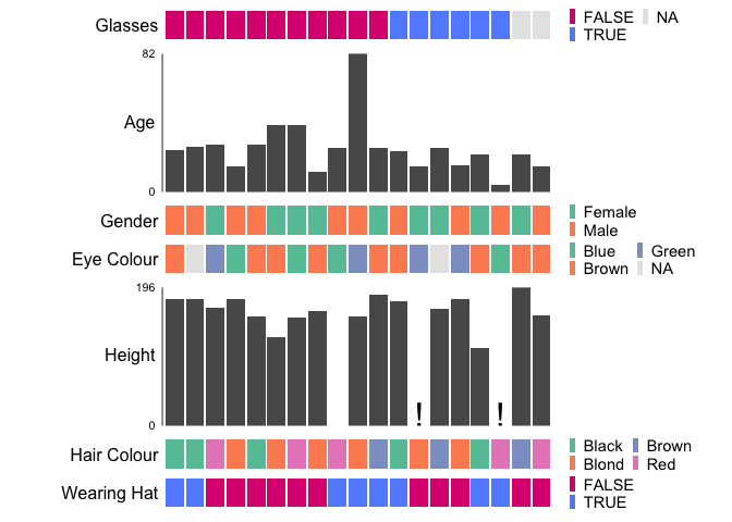 - ggstack: tiled one-dimensional visualisations that more effectively show missingness and complex categorical relationships in smaller datasets.