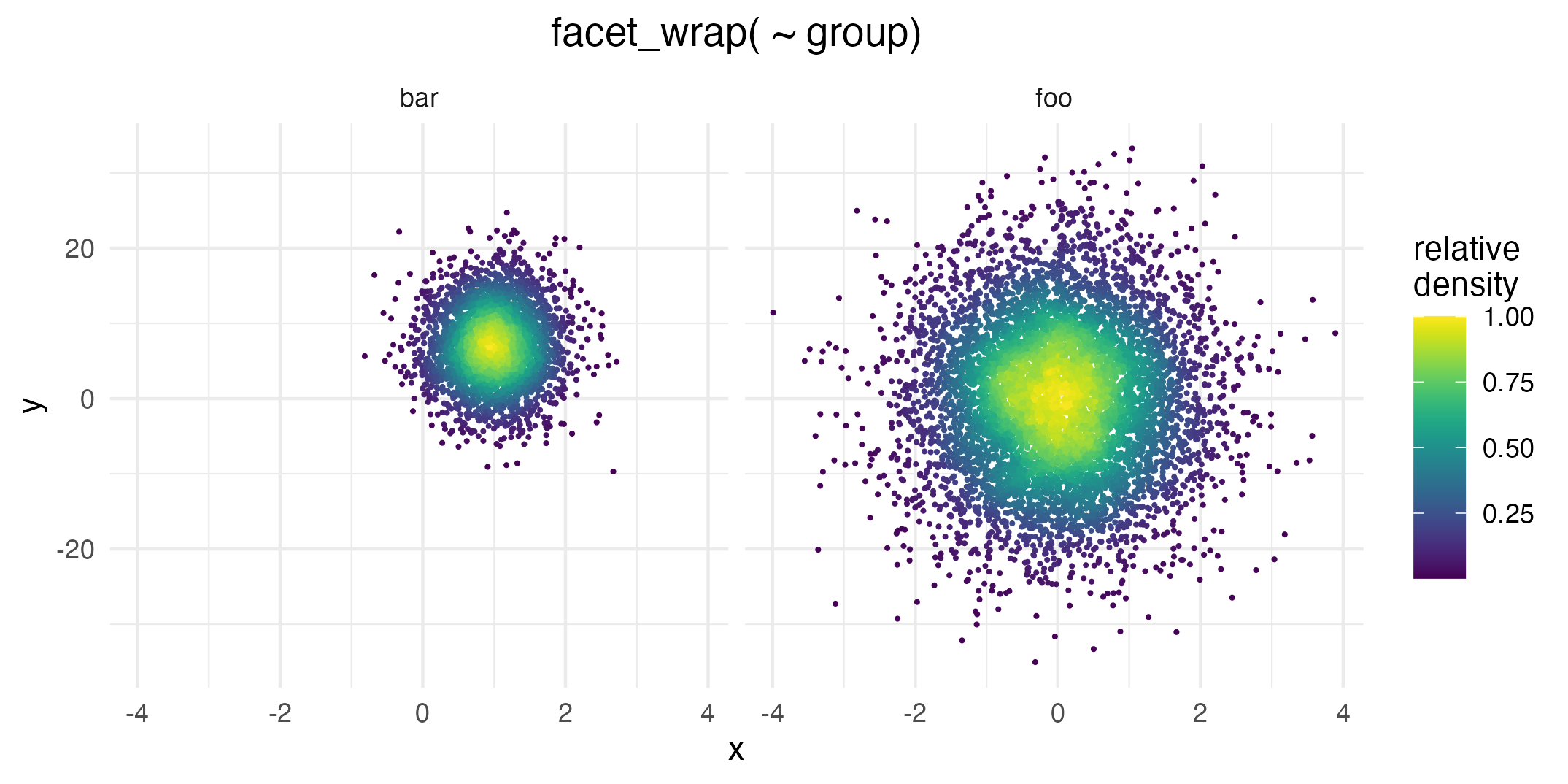 Since plotting the relative density is a common use-case, we provide a little shortcut. Instead of the solution above you can simply use after_stat(ndensity). This is especially useful when facetting data, since sometimes you want to inspect the point density separately for each facet: