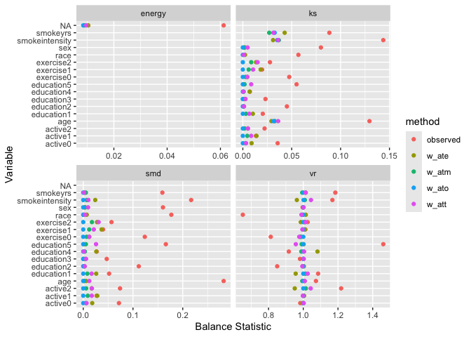 halfmoon includes several techniques for assessing the balance created by propensity score weights.