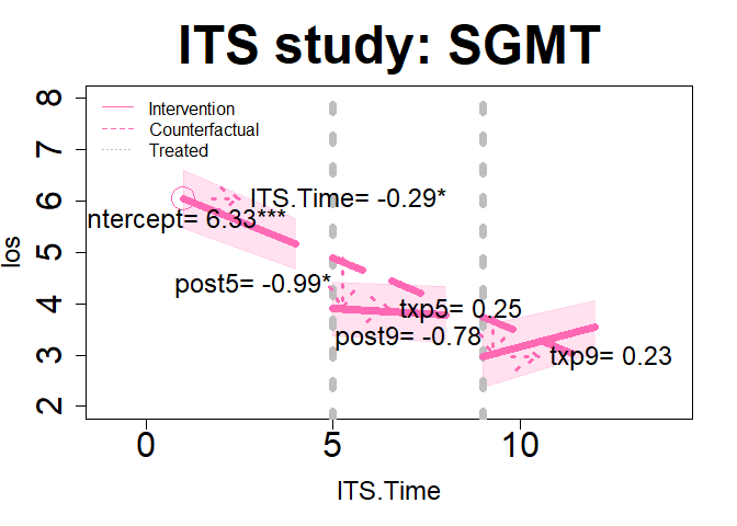 plot(im12, "ITS", add.legend="topleft", xlim=c(-1, 14), ylim=c(2, 8), main="ITS study: SGMT", col="hotpink", lwd=7, cex=3, cex.axis=2, cex.lab=1.5, cex.main=3, arrow=TRUE, xshift=c(.25, .25), cex.text=1.5, coefs=TRUE, round.c=2, cfact=T, conf.int=TRUE, adj.alpha=0.2 )
