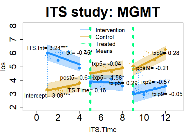 plot(im22, "ITS", add.legend="top", xlim=c(-.75, 13.1), ylim=c(2, 8), main="ITS study: MGMT", col=c("dodgerblue","goldenrod"), lwd=7, cex=2, cex.axis=2, cex.lab=1.5, cex.main=3, cex.legend=1.25, arrow=TRUE, xshift=c(0, .5), cex.text=1.25, name=F, coefs=TRUE, round.c=2, pos.text= list("txp5"=3, "post9"=4), tcol="springgreen", cfact=T, conf.int=TRUE, adj.alpha=0.3, add.means=TRUE)