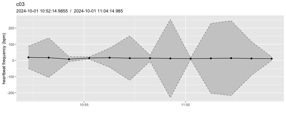Once processed, PULSE data is stored as a tibble with an average heart rate frequency for each channel/split window. The time is relative to the mid-point of the window. Frequencies are expressed in Hz (multiply by 60 to get BPM). In addition, the following information is also provided, which can be used to classify or filter the data: n, the number of identified heart beats, sd, the standard deviation of the intervals between each pair of consecutive peaks, and ci, the confidence interval of the Hz estimate (hz ± ci).
