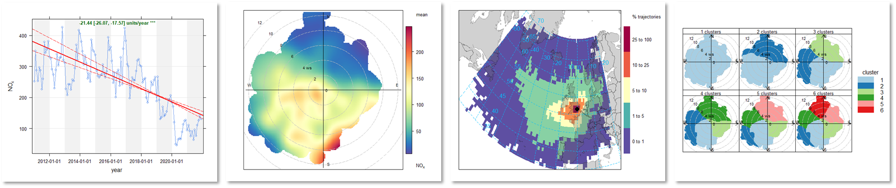 timePlot(),timeVariation(), andcalendarPlot()).Directional analysis to help characterise different sources of pollution, including the creation of bivariate polar plots using