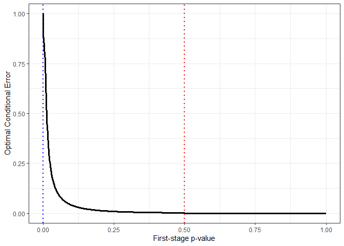 #> Binding first-stage futility boundary (p-value scale): 0.5