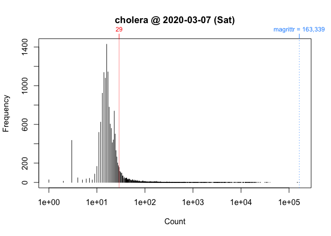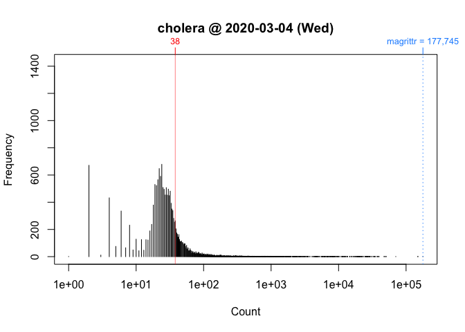 As a “fix”, the missing dates (see cholera::missing.date), cranDownloads() does the following. First, when a missing date is included it prints a message in the console. Second, when plotting two gray polygons are added to the graph to highlight those dates. They are labeled with a “⌀” (empty set) on the top axis. Third, smoothers ignore the missing data.