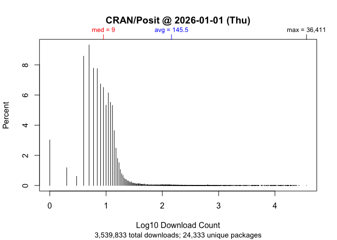package = NULL plot(cranDistribution())- histogram of base10 logarithm of count v. frequency