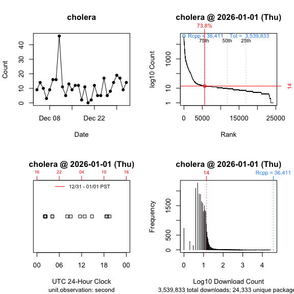 If there’s a problem with the logs (e.g., they’re not posted on time), both ‘cranlogs’ and ‘packageRank’ will be affected. If this happens, you’ll see things like an unexpected zero count(s) for your package(s) (actually, you’ll see a zero download count for both your package and for all of CRAN), data from “yesterday”, or a “Log is not (yet) on the server” error message.
