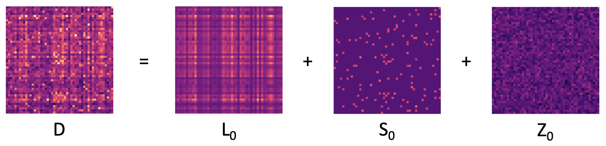 a low-rank matrix $L_0$ encoding consistent patterns of exposure, a sparse matrix $S_0$ isolating unique or outlying exposure events (that cannot be explained by the consistent exposure patterns), and dense noise $Z_0$.