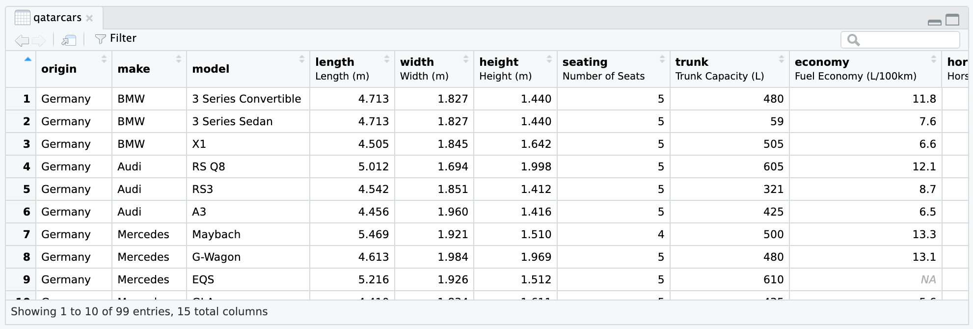 qatarcarswill load as a tibble with nicer printing output; if you do not have {tibble} installed, the data will load as a standard data frame.