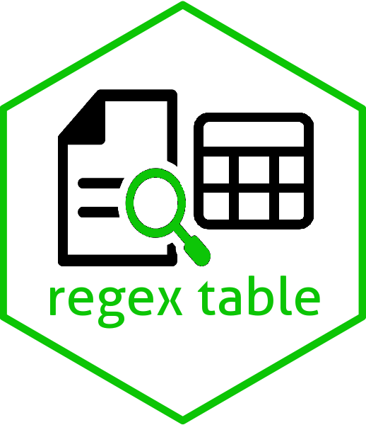 data: A vector of text to search (typically a data frame with atextcolumn)regex_table: A lookup table (a data frame with a column of strings or regular expressions to search for, typically calledpattern)