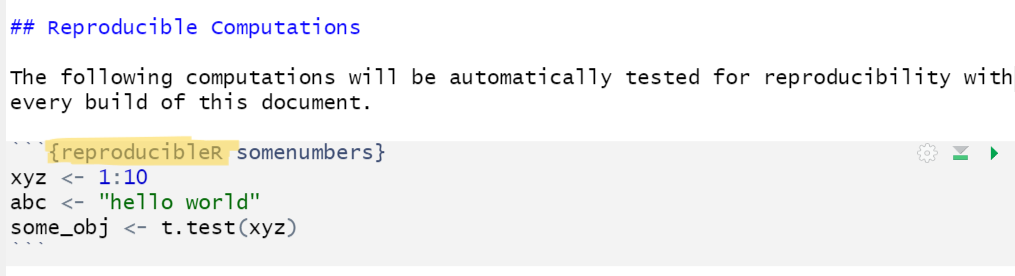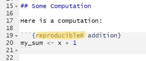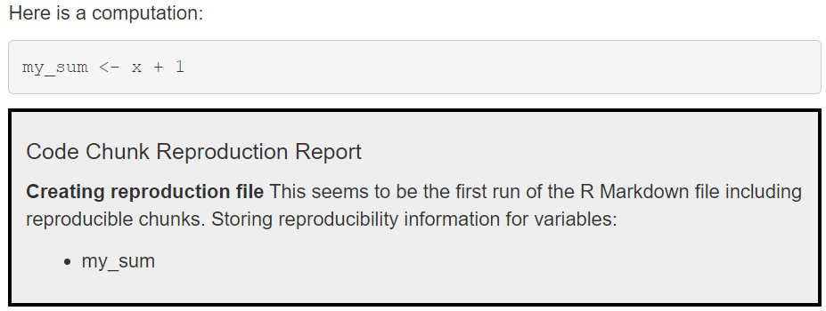 This package allows you to make computational results in R testable for reproduction (does the same script with the same data produce the same results, e.g. on a different computer and/or later in time). There is only a single thing you need to change in your analysis if you are already using RMarkdown: Load the package at the beginning of your R Markdown file (library(reproducibleRchunks)