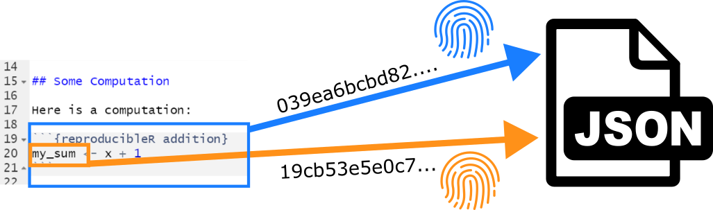 code chunks as regular R code and gathers information about all variables that are newly declared in a given chunk. The contents of those variables are stored in a separate JSON data file (which is labeled according to the name of original Markdown file and the chunk label preceded by the prefix .repro