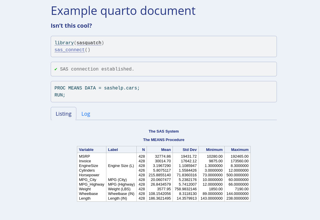 And of course, render beautiful HTML or latex quarto/rmarkdown documents in the same style you would expect from SAS with the sas_engine().