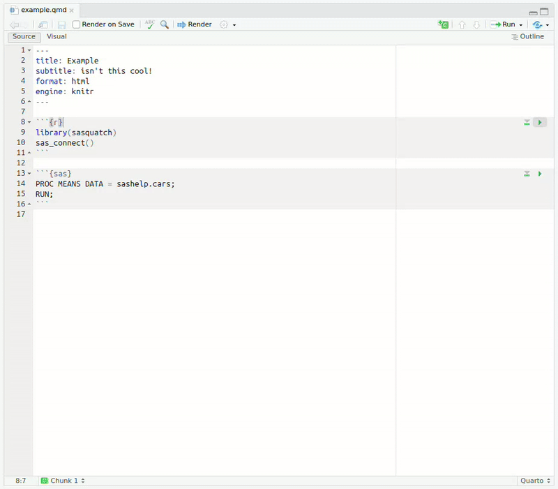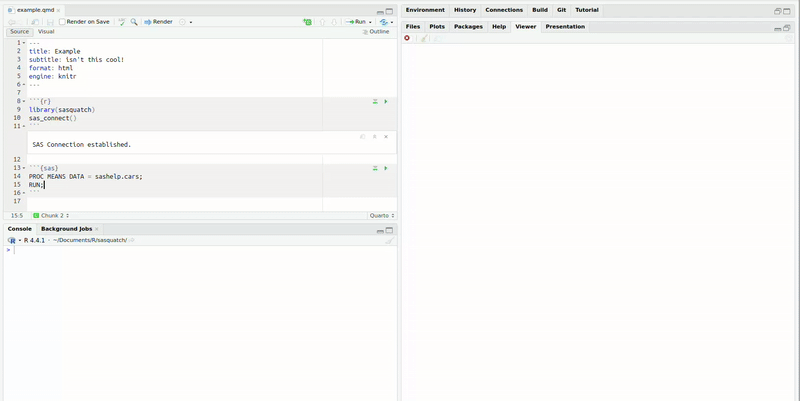 sasrworks identically tosasquatchrelying on theSASPyPython package to interface with SAS, but does not include any interactive, file management, or quarto functionality.