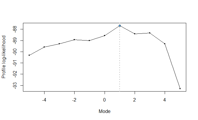 The mode_estimation object, of class “choose_mode”, consists of a list whose elements represent a modified SDL regression fit for each value specified for the mode (by default, the sequence $-5, -4, \ldots, 4, 5$). We see that $\xi = 1$ generates the highest profiled likelihood.