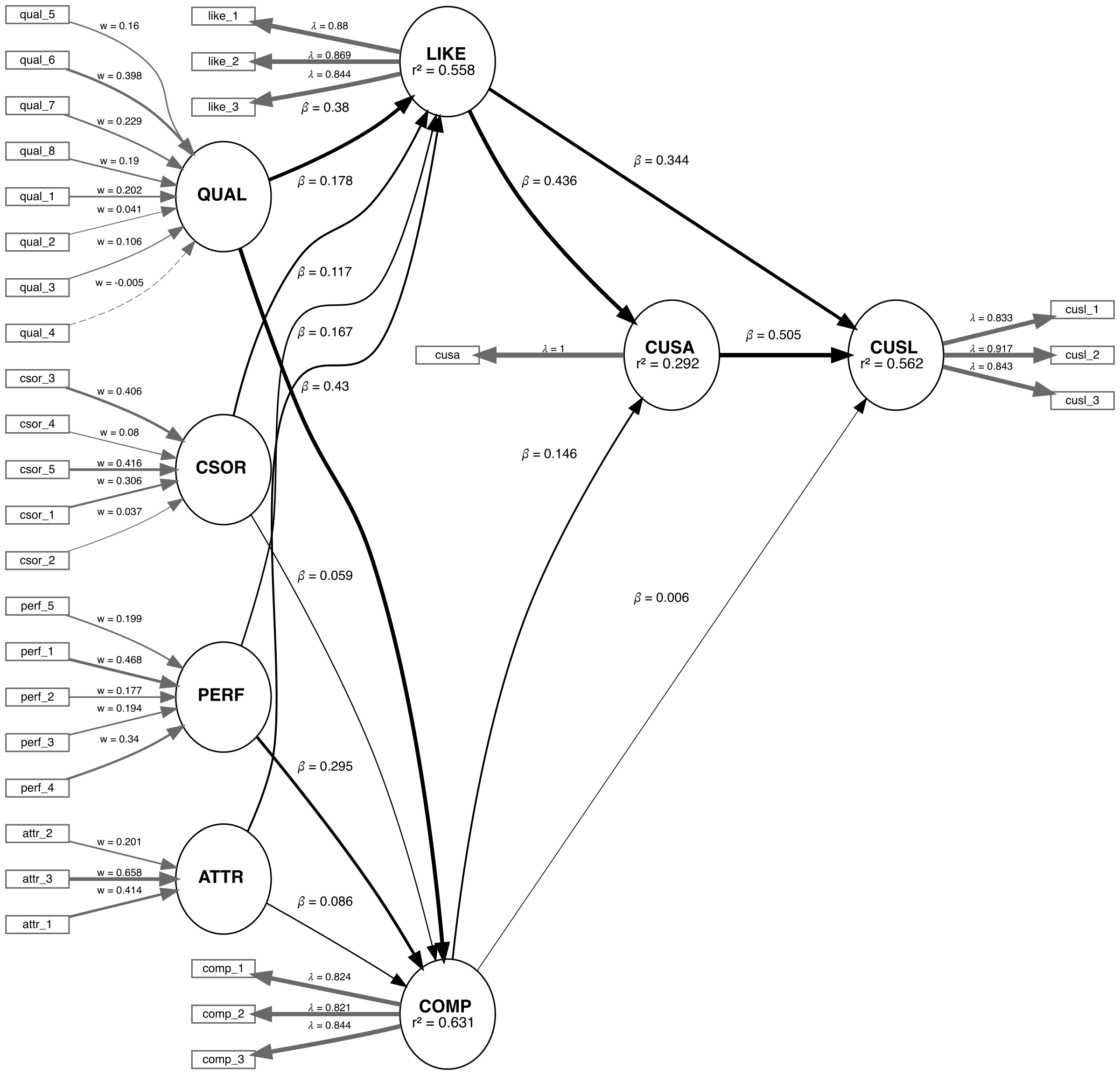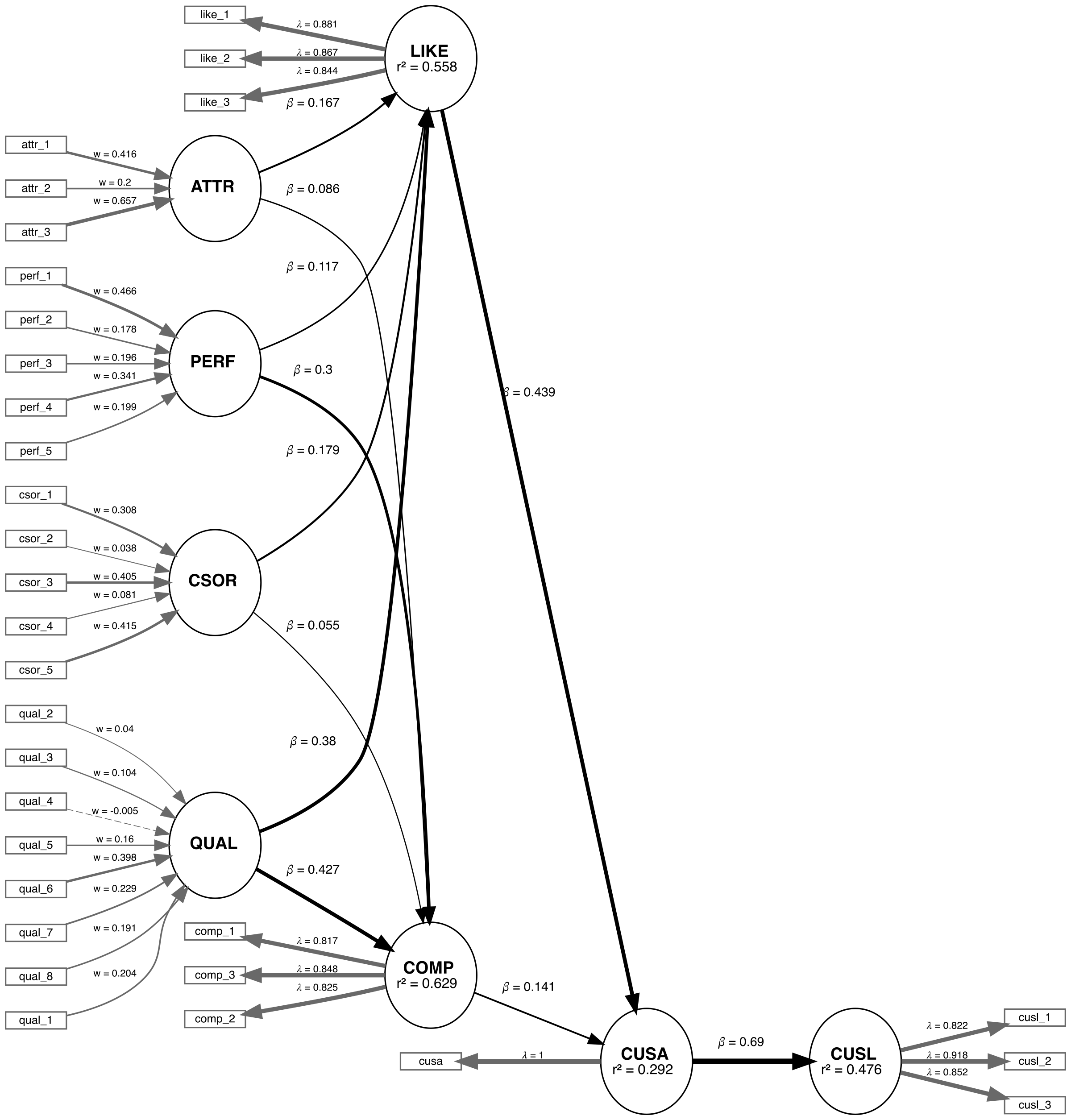 paths(from = c("QUAL", "PERF", "CSOR", "ATTR"), to = c("COMP", "LIKE")),
