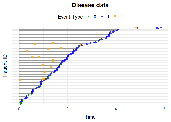 The function simDisease simulates health care data from a setting where patients can experience $3$ different events: