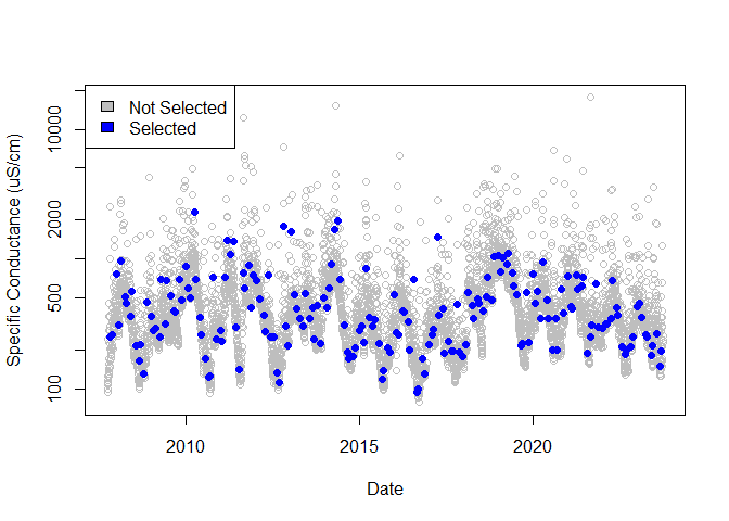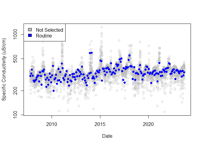The subsample() function will perform stratified subsampling to produce a smaller, representative data set a daily water quality record. This function does use the base R sample() function, therefore a seed parameter (default is 123) is provided to ensure results are reproducible.