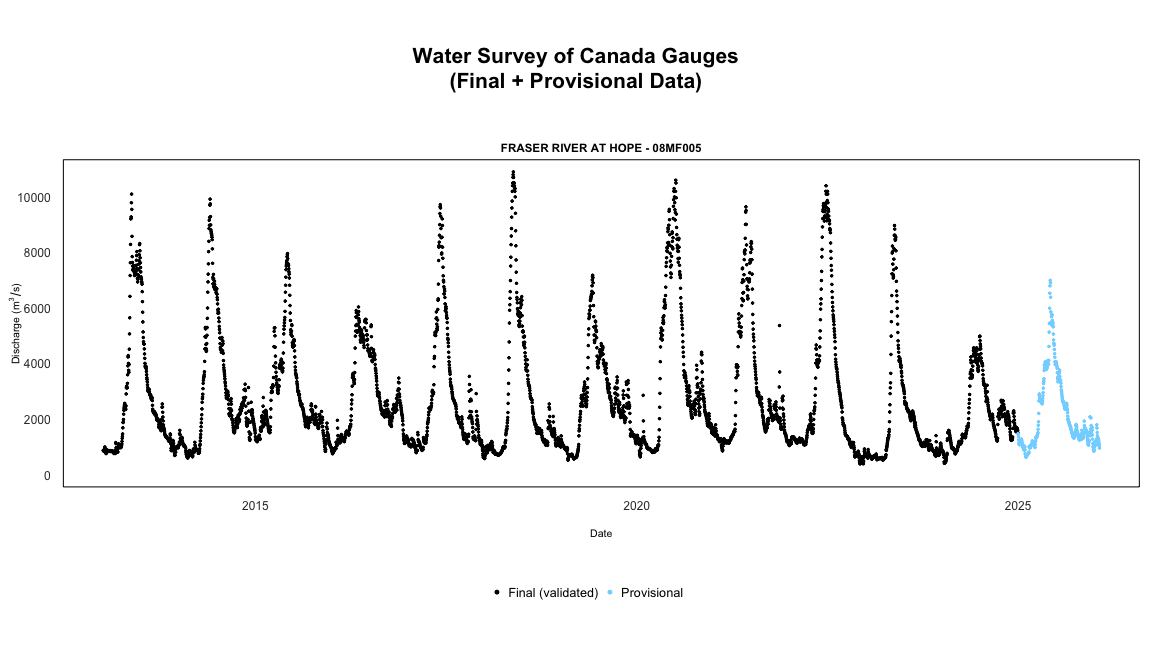 Note that provisional data is aggregated to daily means to match the daily format of HYDAT data. For non-aggregated real-time data at sub-daily intervals, use realtime_ws() directly.