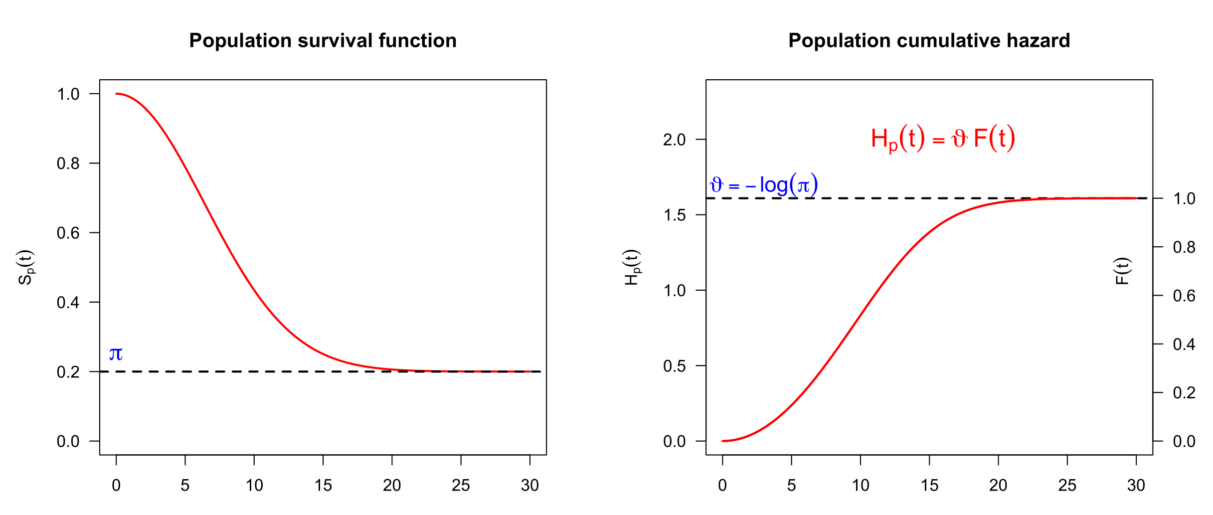 The starting point is the bounded cumulative hazard model (also name the promotion time model) (Tsodikov 1998) with population survival function $$S_p(t|\mathbf{v}) = \exp{-H_p(t|\mathbf{v})} =\exp{-{\vartheta(\mathbf{v})} F(t)},$$ bounded hazard $H_p(t|\mathbf{v})$ and cure fraction $\pi(\mathbf{v})=S_p(+\infty|\mathbf{v})=\exp{-{\vartheta(\mathbf{v})}}$, see Figure 1. Function $F(t)$ is a c.d.f. governing the population hazard dynamics, with $F(0)=1$ and $F(T)=1$ where $T$ is the minimum value of time after which an event-free unit is considered cured.