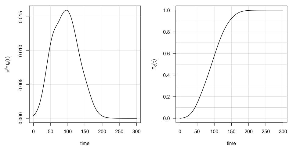 The estimated reference hazard $\mathrm{e}^{\beta_0}f_0(t)$ and the associated c.d.f. function $F_0(t)$ governing the baseline dynamics of the cumulative hazard can also visualized,