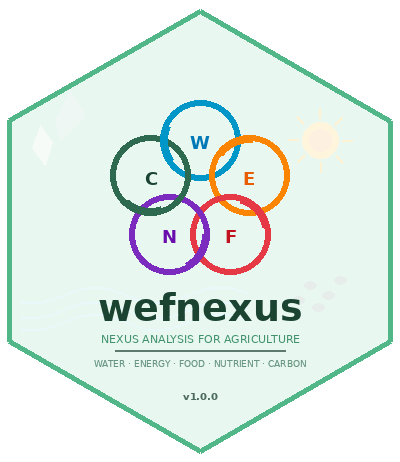 wefnexus provides a comprehensive toolkit for analyzing Water-Energy-Food-Nutrient-Carbon (WEFNC) nexus interactions in agricultural production systems. It includes 68 functions across 6 modules with a nexus integration layer.